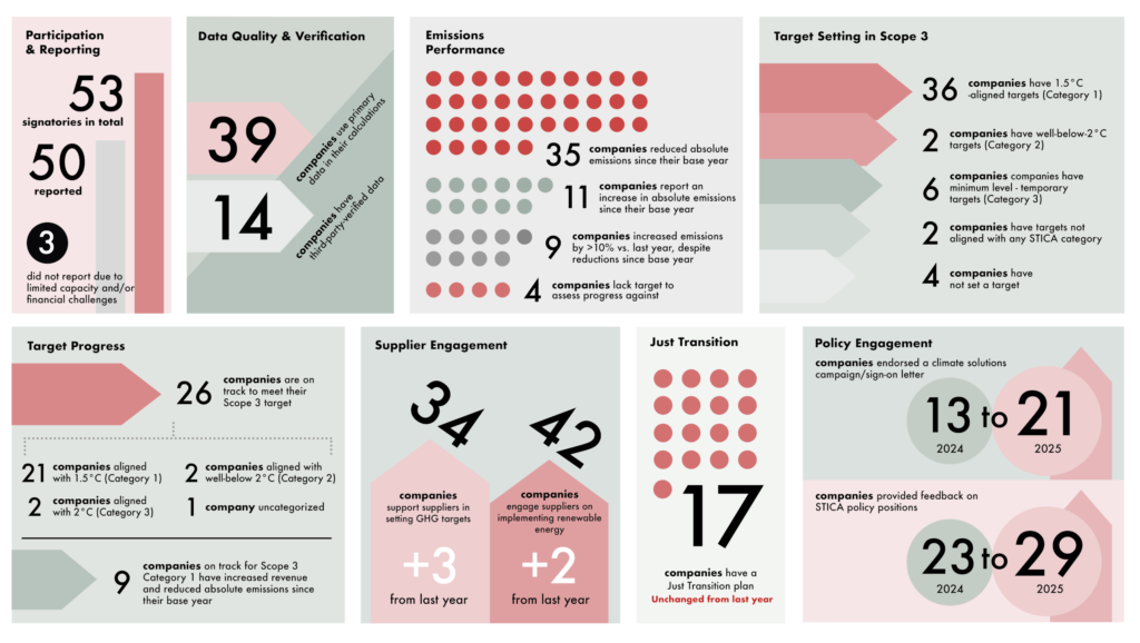 STICA’s Company Climate Action Program 2025 Progress Report presents individual company disclosures and aggregate data on the progress of signatory members’ Climate Action Transition Plans, based on emissions data from their most recent financial year. It also provides an analysis and general conclusions drawn by the Sustainable Fashion Academy (SFA).